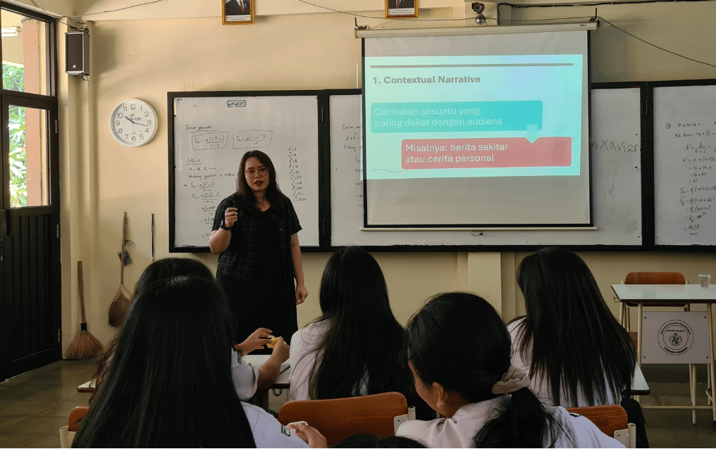 Di kelas lainnya, Manager Akademik Fikom Untar, Septia Winduwati, S.Sos., M.Si. menghadirkan pelatihan interaktif bertema “Pelatihan Storytelling Public Speaking untuk Siswa.” Dalam sesi ini, para peserta diajak untuk melatih keberanian tampil di depan publik dan menyampaikan pesan secara menarik. “Kemampuan berbicara adalah kunci untuk memengaruhi audiens — baik di atas panggung maupun di dunia digital,” jelas Septia.